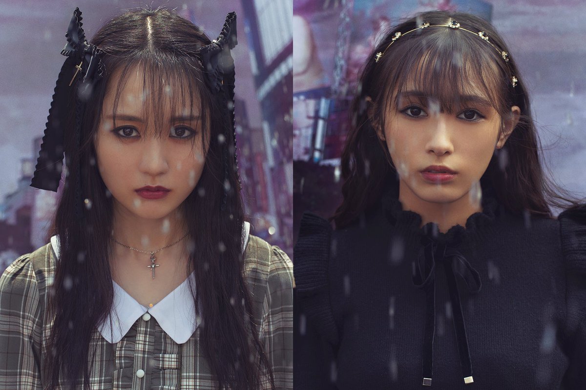 乃木坂46の“新エース”賀喜と欅坂46の“ビジュアルクイーン”渡辺が美の競演。ブレードランナーがテーマのファッションシュートに臨んだ2人は、小道具として銃を使った撮影にテンションアップ。