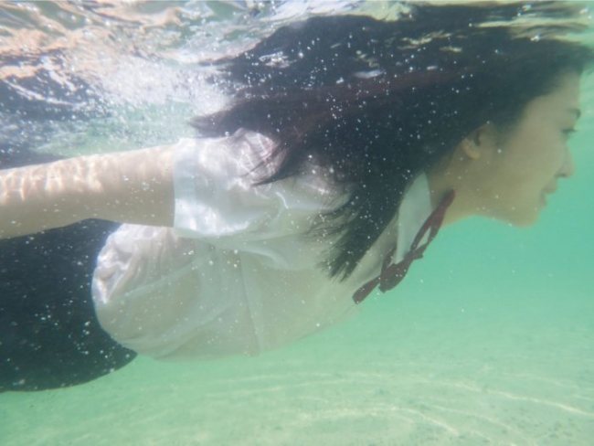 制服姿のまま海に飛び込み、島で育った自然児らしく、塩水の中でも目を開けてダイナミックな泳ぎを見せた長濱は「五島列島のすごくきれいな海に、制服のまま飛び込んで泳ぎました!近くで、長崎名物のトビウオが泳いでました。水中で頑張って目を開けているところも見てほしいです」とアピールしている。